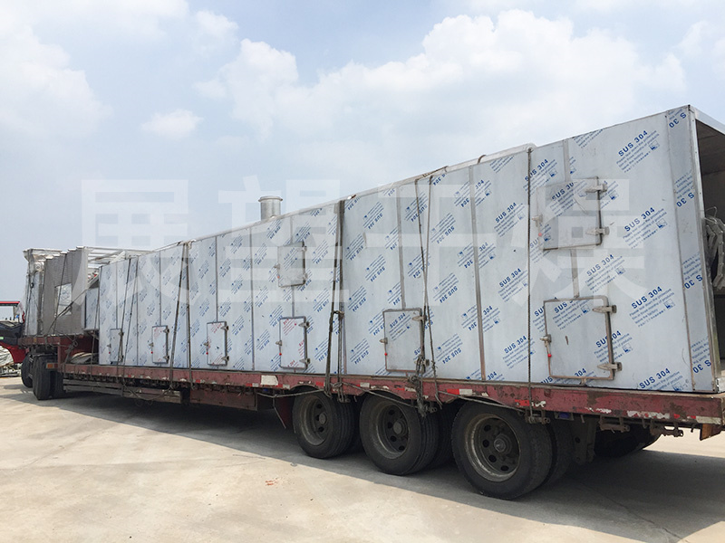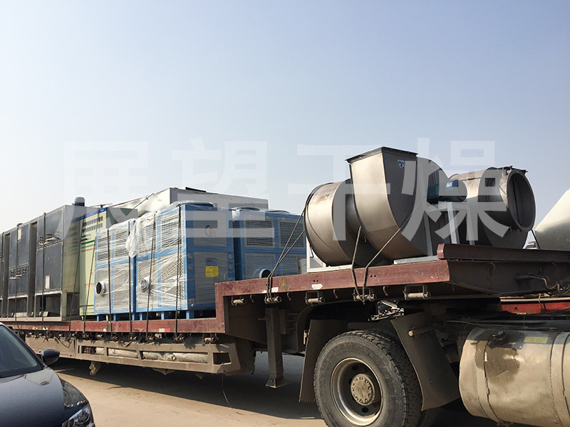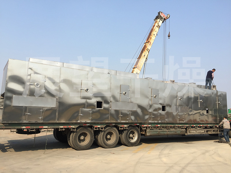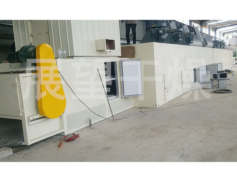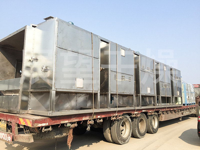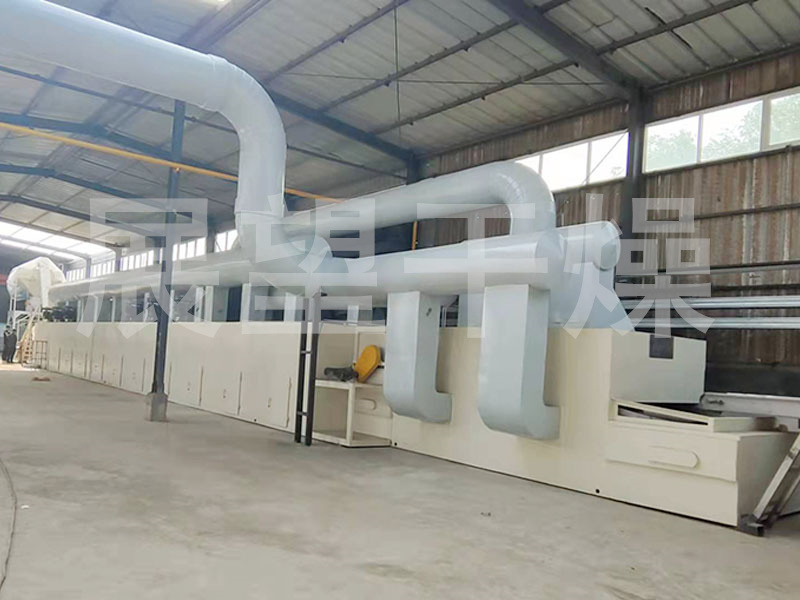 物料由加料器均匀地铺在网带上,网带一般采用12-60目不锈钢丝网,由传动装置拖动在干燥机内移动。干燥机由若干单元组成,每一单元热风独立循环,部分尾气由专门排湿风机排出,废气由调节阀控制,热气由下往上或由上往下穿过铺满物料的网带完成热量与质量传递的进程,带走物料水份。网带缓慢移动,运行速度可根据物料温度自由调节,干燥后的成品连续落入收料器中。上下循环单元根据用户需要可灵活配备,单元数量亦可根据需要选取。